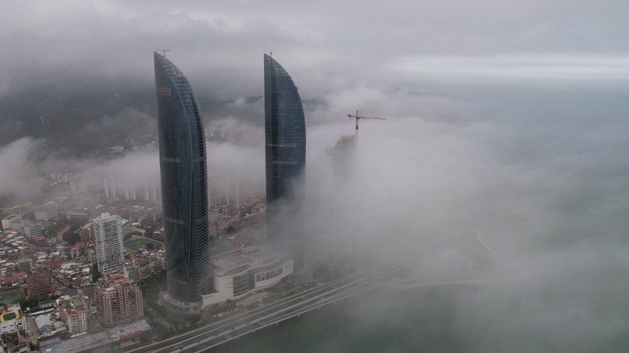 Vista aérea del 26 de mayo de 2022 del paisaje de la niebla de advección, en Xiamen, en la provincia de Fujian, en el sureste de China. (Xinhua/Ye Yiheng)