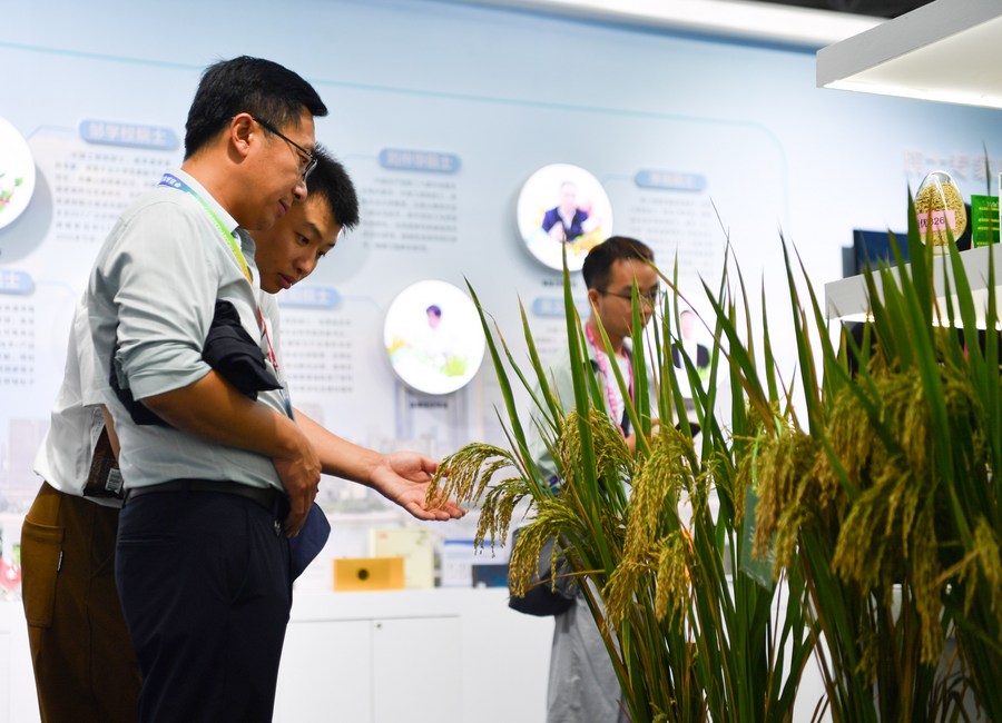 Visitantes observan muestras de cultivos durante la XXX Feria de Alta Tecnología Agrícola de Yangling China, en Yangling, en la provincia de Shaanxi, en el noroeste de China, el 19 de septiembre de 2023. (Xinhua/Zhang Bowen)