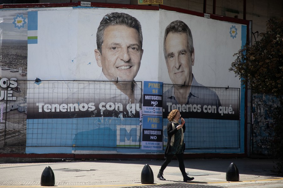Una mujer camina frente a una propaganda electoral del candidato a la Presidencia de Argentina por el espacio Unión por la Patria, Sergio Massa, en la ciudad de Buenos Aires, Argentina, el 20 de octubre de 2023. (Xinhua/Martín Zabala)