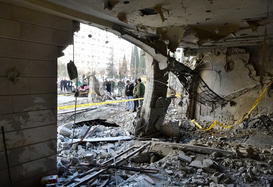 Imagen del 19 de febrero de 2023 de un edificio dañado en el barrio residencial de Kafar Sousah, Damasco, Siria, tras un ataque israelí con misiles. (Xinhua/Ammar Safarjalani)