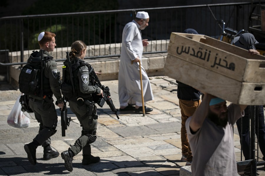 Imagen del 13 de octubre de 2023 de policías patrullando alrededor de la Ciudad Vieja de Jerusalén. (Xinhua/Chen Junqing)