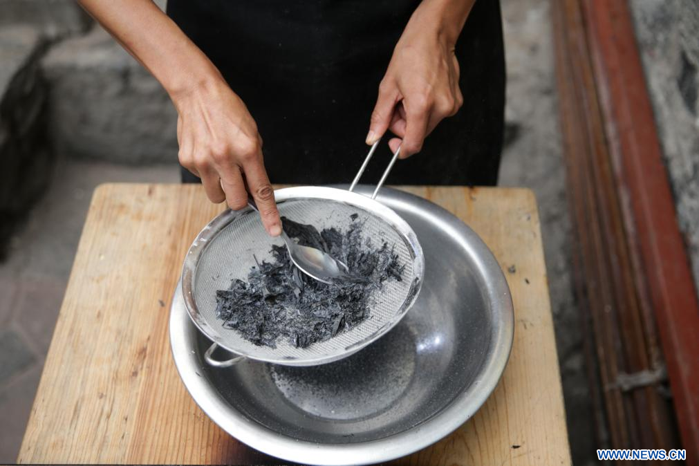 Imagen del 25 de octubre de 2023 de una mujer preparando la ceniza de totomoxtle (hoja de maíz) para la elaboración del pan de muerto negro en el Centro Cultural Independiente "Ey Maguey", en la Ciudad de México, capital de México. Un olor a pan recién horneado, fresco, combinado con un mágico aroma a azahar, invade todos los espacios del Centro Cultural Independiente "Ey Maguey", donde una comunidad originaria produce el delicioso pan de muerto negro para celebrar el Día de Muertos, los días 1 y 2 de noviembre, en México. (Xinhua/Francisco Cañedo)