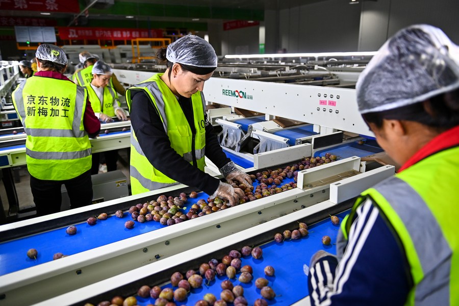 Trabajadoras confirman la calidad de ciruelas clasificadas automáticamente en un centro inteligente de cadena de suministro de JD Logistics en el distrito de Jiashi, en la región autónoma uygur de Xinjiang, en el noroeste de China, el 30 de agosto de 2023. (Xinhua/Ding Lei)