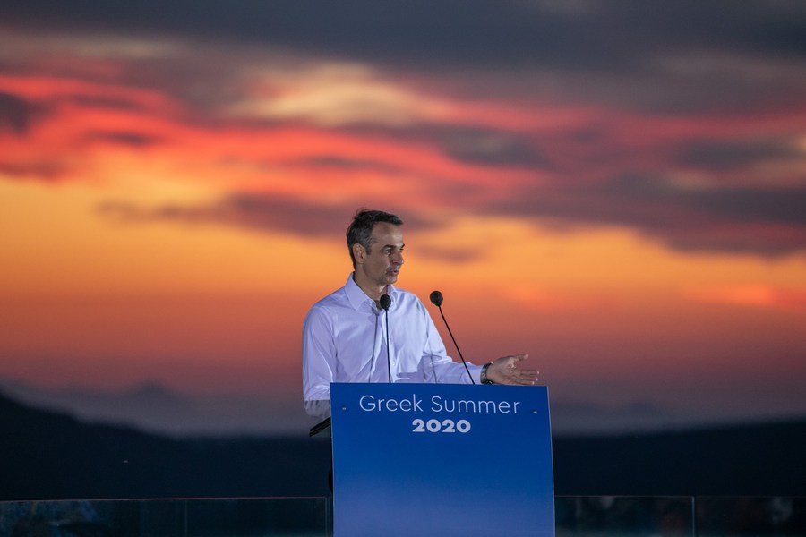 Imagen de archivo del primer ministro griego, Kyriakos Mitsotakis, hablando durante una conferencia de prensa con representantes de los medios de comunicación internacionales, en la isla de Santorini, Grecia, el 13 de junio de 2020. (Xinhua/Lefteris Partsalis)
