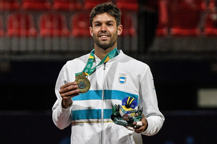 Imagen del 29 de octubre 2023 del jugador Facundo Díaz Acosta, de Argentina, posando al término del partido correspondiente a la final individual masculina de tenis en los Juegos Panamericanos Santiago 2023, ante Tomás Barrios, de Chile, en Santiago, capital de Chile. (Xinhua/Jorge Villegas)
