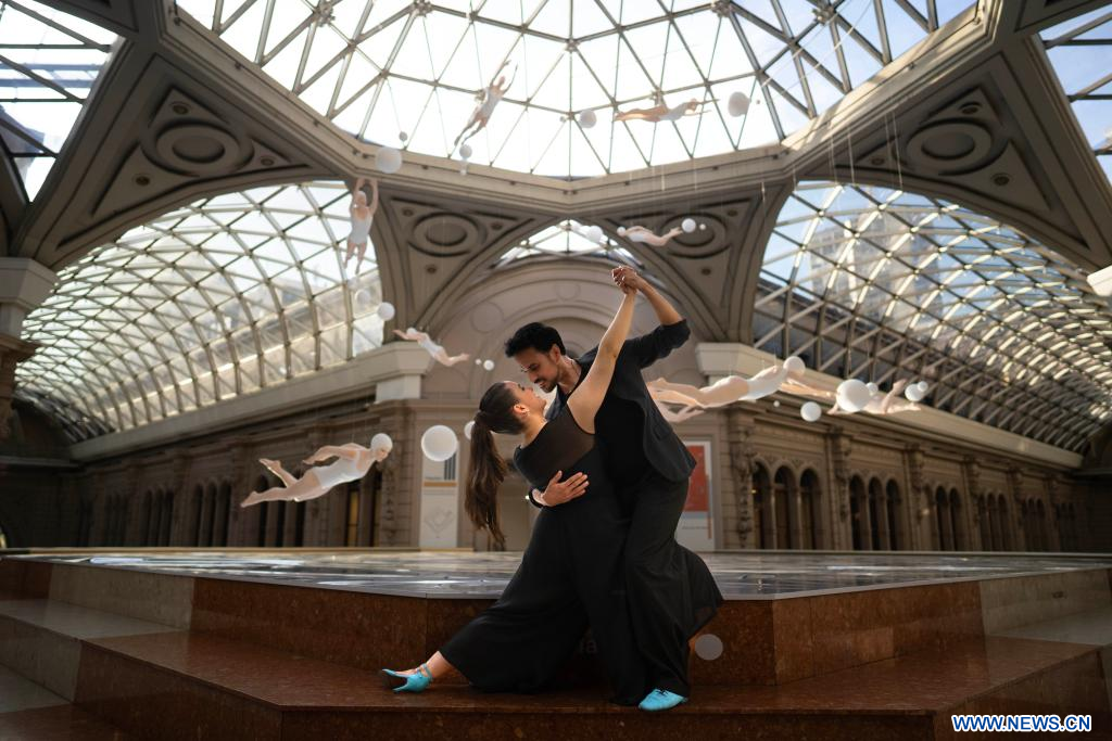 Imagen del 9 de noviembre de 2023 de bailarines de la Compañía de Tango de la Universidad Nacional de las Artes bailando tango durante una intervención performática en uno de las salas del Centro Cultural Borges, en la ciudad de Buenos Aires, Argentina. La magia del tango envolvió el jueves la ciudad de Buenos Aires con cinco prestigiosas instituciones culturales que dispusieron sus espacios para llevar a cabo de forma simultánea un conjunto de exhibiciones musicales y de baile con el objetivo de homenajear este género representativo de la tradición rioplatense. (Xinhua/Martín Zabala)