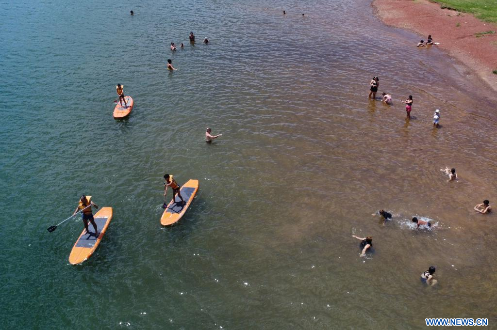 Imagen tomada con un dron de personas disfrutando de su tiempo libre durante un día caluroso en el lago Paranoá, en Brasilia, Brasil, el 11 de noviembre de 2023. La temperatura media en Brasil alcanzó un nivel récord por cuarto mes consecutivo en octubre, divulgó el jueves el estatal Instituto Nacional de Meteorología, diciendo que de julio a octubre la diferencia entre el valor registrado y la media histórica, técnicamente denominada como "desviación", fue superior a un grado Celsius (°C). (Xinhua/Lucio Tavora)