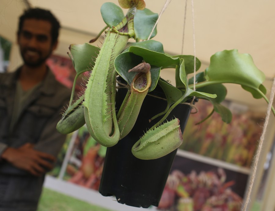 Un vendedor de plantas carnívoras espera por visitantes en la Feria de Productos Ecológicos y Servicio para la Agricultura durante el Festival de Ciudades Verdes, en Lima, Perú, el 9 de noviembre de 2023. (Xinhua/Mariana Bazo)