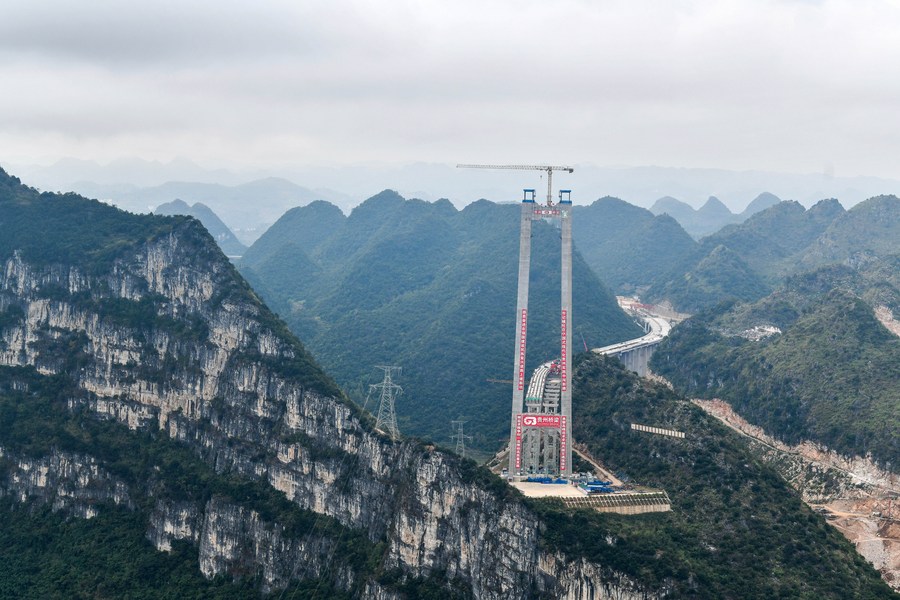 La foto, tomada el 8 de noviembre de 2023, muestra el sitio de construcción del puente del gran cañón de Huajiang, en la provincia suroccidental china de Guizhou.(Xinhua/Yang Wenbin)