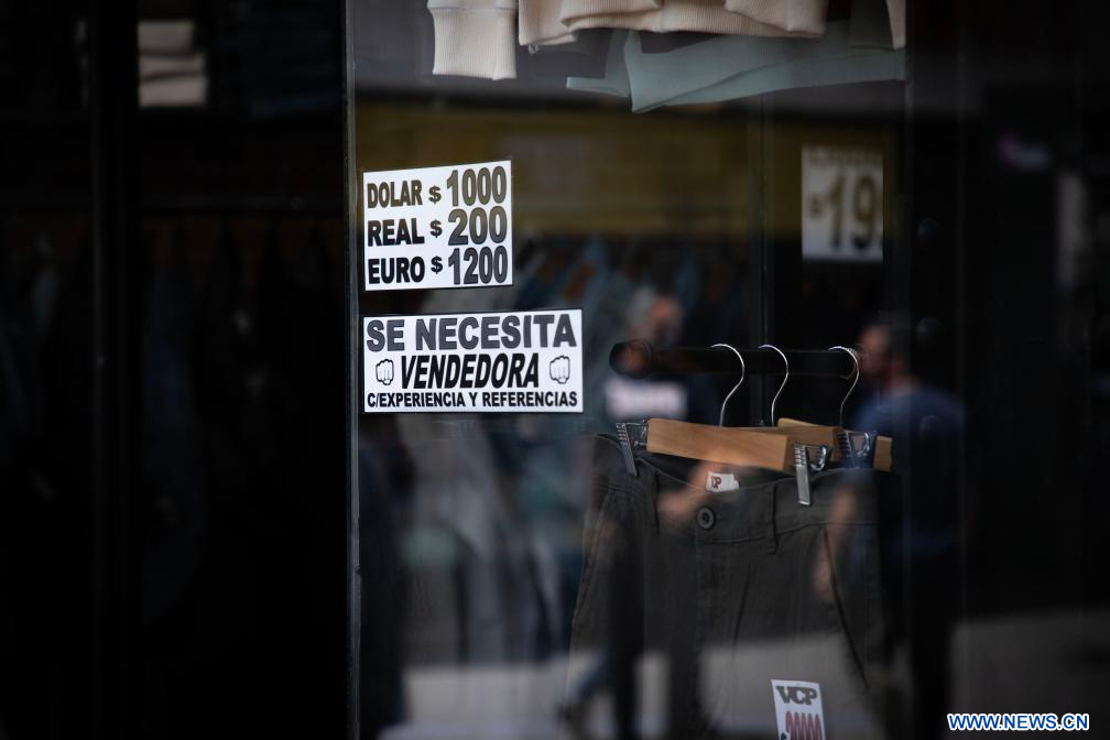 Imagen del 21 de noviembre de 2023 de un cartel indicando la cotización del dólar paralelo en un local comercial, en la ciudad de Buenos Aires, Argentina. El Gobierno de Argentina emitió el martes nueva deuda en moneda local equivalente a unos 4.931 millones de dólares (según el tipo de cambio oficial) durante la última operación de licitación de títulos públicos del año, según informó el Ministerio de Economía. (Xinhua/Martín Zabala)