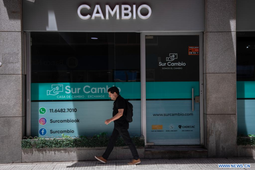 Imagen del 21 de noviembre de 2023 de un hombre caminando frente a un local de venta de divisas, en la ciudad de Buenos Aires, Argentina. El Gobierno de Argentina emitió el martes nueva deuda en moneda local equivalente a unos 4.931 millones de dólares (según el tipo de cambio oficial) durante la última operación de licitación de títulos públicos del año, según informó el Ministerio de Economía. (Xinhua/Martín Zabala)