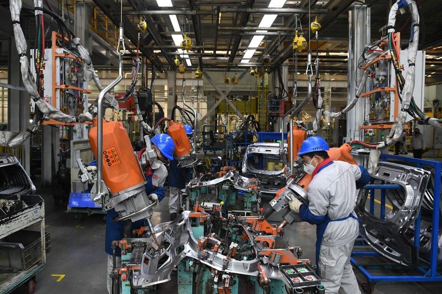 Trabajadores laboran en una fábrica del fabricante de automóviles chino Chery Holding Group Co., Ltd. en Erdos, en la región autónoma de Mongolia Interior, en el norte de China, el 9 de febrero de 2023. (Xinhua/Bei He)