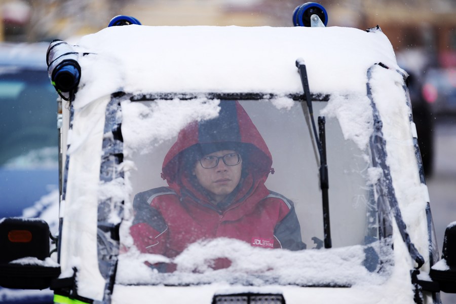 Un repartidor conduce bajo la nieve, en Harbin, en la provincia de Heilongjiang, en el noreste de China, el 23 de noviembre de 2023. (Xinhua/Wang Jianwei)
