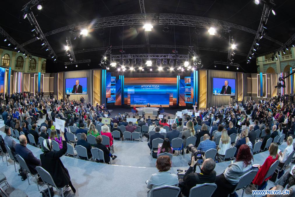 Imagen del 14 de diciembre de 2023 de la conferencia de prensa anual y sesión de preguntas y respuestas del presidente ruso, Vladimir Putin, en Moscú, Rusia. (Xinhua/Bai Xueqi)