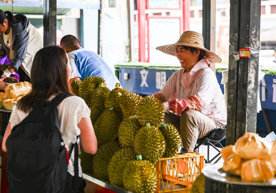 Vendedores vietnamitas ofrecen durians en Dongxing, en la región autónoma de la etnia zhuang de Guangxi, al sur de China, el 18 de mayo de 2023. (Xinhua/Hu Xingyu)