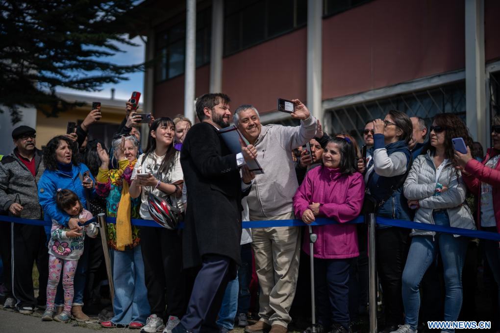 PUNTA ARENAS, 17 diciembre, 2023 (Xinhua) -- Imagen cedida por la Presidencia de Chile del presidente chileno, Gabriel Boric (i-frente), tomándose una fotografía con simpatizantes después de emitir su voto en un centro electoral, en la ciudad de Punta Arenas, Chile, el 17 de diciembre de 2023. Los chilenos vuelven a votar el domingo, tras el rechazo a la propuesta anterior en 2022, en un plebiscito constitucional con carácter obligatorio, en una jornada con altas temperaturas en la zona central, miles de personas que presentaron sus excusas para no sufragar y promesas de concluir el proceso constituyente sea cual sea el resultado. (Xinhua/Presidencia de Chile)