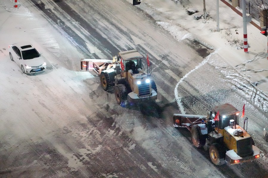 Una máquina quitanieves limpia la nieve en la calle Yantai, provincia de Shandong, en el este de China, el 16 de diciembre de 2023. (Xinhua/Tang Ke)