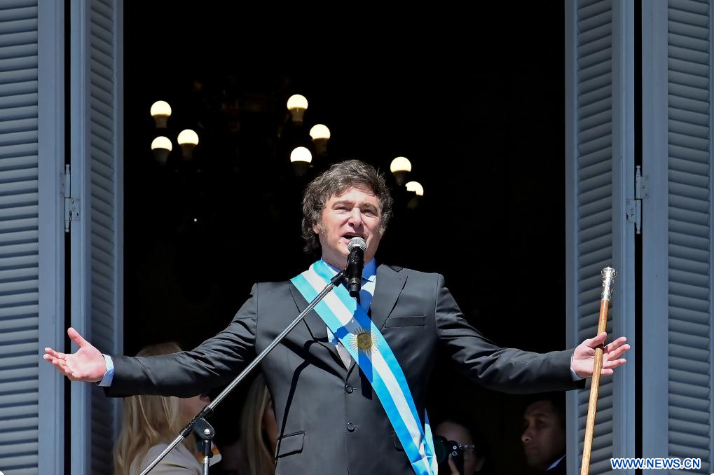 Imagen del 10 de diciembre de 2023 del presidente argentino, Javier Milei, reaccionando desde un balcón de la Casa Rosada después de la ceremonia de Asunción Presidencial, en la ciudad de Buenos Aires, Argentina. Cansados de los malos resultados del Gobierno de izquierda del presidente Alberto Fernández (2019-2023), los argentinos dieron sobre el cierre del 2023 un giro de 180 grados y eligieron como mandatario para los próximos cuatro años al liberal Javier Milei, quien se ha propuesto implementar un drástico cambio, tanto en lo económico como en lo político y social. (Xinhua/Germán García Adrasti)