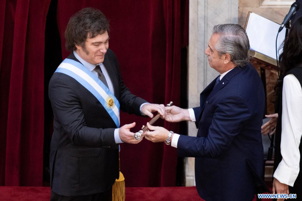 Imagen del 10 de diciembre de 2023 del presidente saliente Alberto Fernández (d) entregando los atributos de mando a su sucesor, Javier Milei (i), durante la ceremonia de Asunción Presidencial, en el Congreso Nacional, en la ciudad de Buenos Aires, Argentina. Cansados de los malos resultados del Gobierno de izquierda del presidente Alberto Fernández (2019-2023), los argentinos dieron sobre el cierre del 2023 un giro de 180 grados y eligieron como mandatario para los próximos cuatro años al liberal Javier Milei, quien se ha propuesto implementar un drástico cambio, tanto en lo económico como en lo político y social. (Xinhua/Martín Zabala)