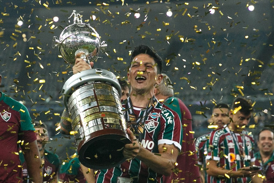 Imagen del 4 de noviembre de 2023 del jugador Germán Cano, de Fluminense de Brasil, festejando con el trofeo al término del partido correspondiente a la final de la Copa Libertadores 2023, ante Boca Juniors de Argentina, celebrado en el Estadio Maracaná, en Río de Janeiro, Brasil. (Xinhua/Claudia Martini)