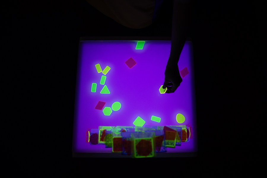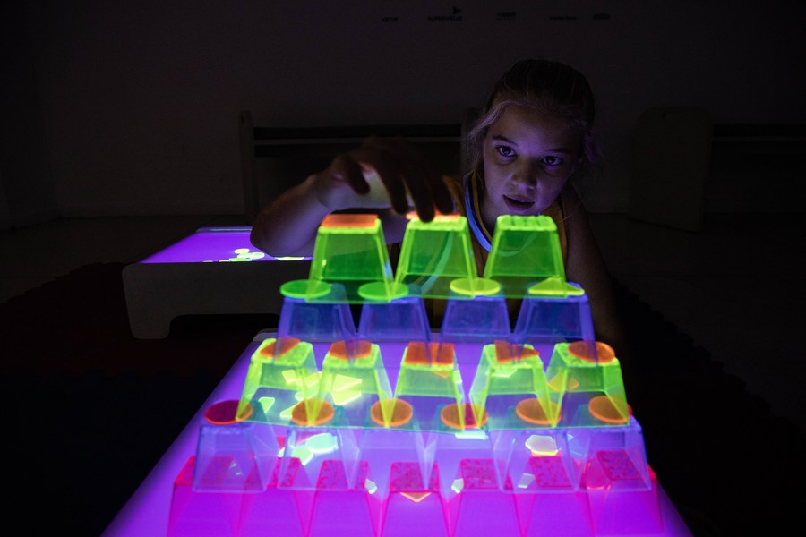 Imagen del 4 de enero de 2024 de Macarena, de 12 años de edad, jugando con herramientas educativas fluorescentes durante una de las actividades que conforman las propuestas para las vacaciones de verano "Mapa de aventuras" en el Museo de Arte Moderno, en la ciudad de Buenos Aires, capital de Argentina. (Xinhua/Martín Zabala)