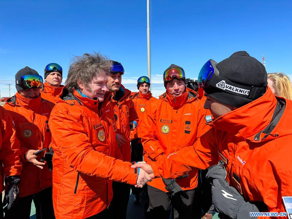ANTARTIDA, 7 enero, 2024 (Xinhua) -- Imagen proveída por la Agencia de Noticias Télam del 6 de enero de 2024 del presidente argentino, Javier Milei (i-frente), saludando a empleados temporales que realiza tareas, en la Base Marambio, Antártida. Milei puso en marcha el sábado un programa para estudiar la contaminación marina por plásticos en la Antártida, iniciativa que engloba esfuerzos coordinados por el país sudamericano y el Organismo Internacional de Energía Atómica. (Xinhua/TELAM)