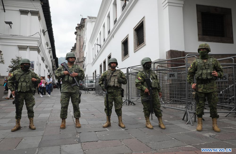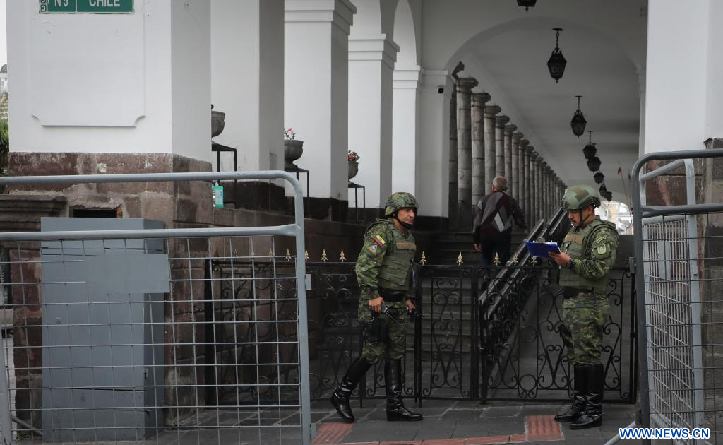 QUITO, 9 enero, 2024 (Xinhua) -- Militares vigilan en el exterior del Palacio de Carondelet, en Quito, capital de Ecuador, el 9 de enero de 2024. La crisis de seguridad que golpea a Ecuador se agudizó en las últimas horas con una serie de hechos violentos como incineración de vehículos en las calles, secuestro de policías y motines en cárceles con guardias retenidos, en plena vigencia de un "estado de excepción" con toque de queda decretado por el Gobierno. (Xinhua/Str)