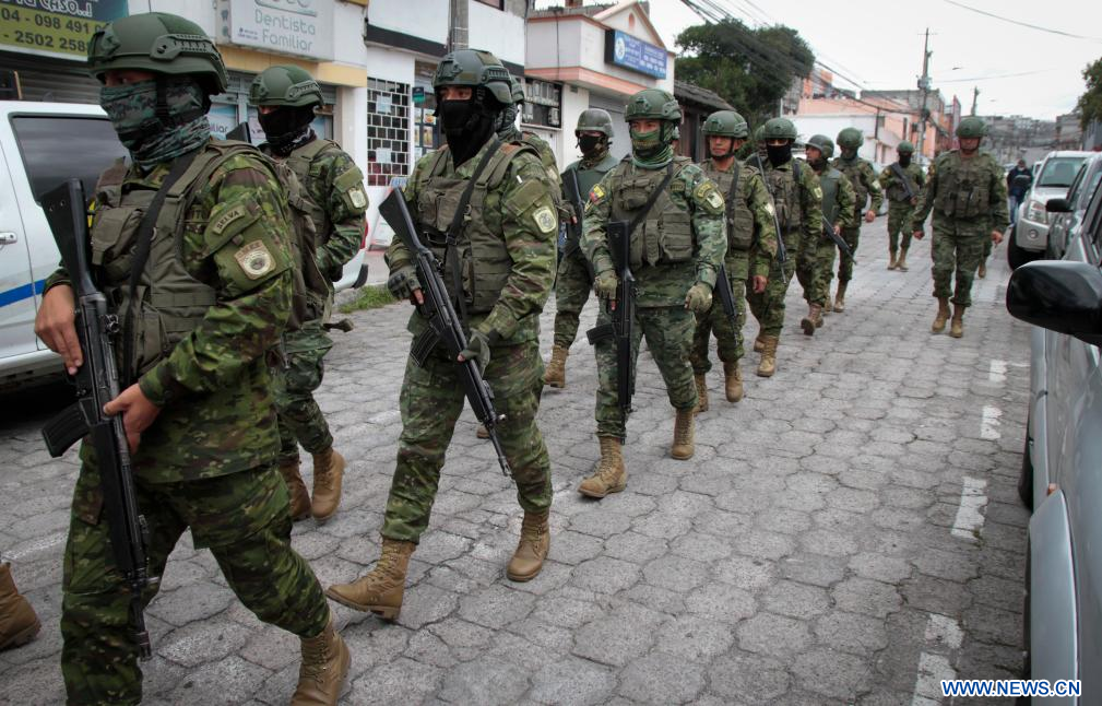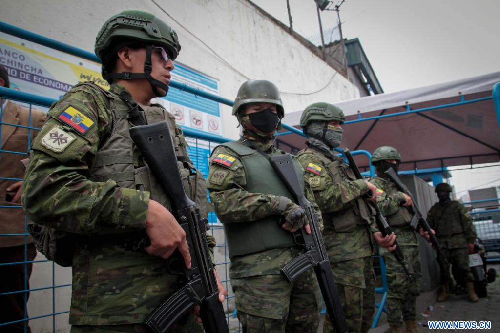 QUITO, 9 enero, 2024 (Xinhua) -- Militares vigilan en un Centro de Rehabilitación Social, en Quito, capital de Ecuador, el 9 de enero de 2024. La crisis de seguridad que golpea a Ecuador se agudizó en las últimas horas con una serie de hechos violentos como incineración de vehículos en las calles, secuestro de policías y motines en cárceles con guardias retenidos, en plena vigencia de un "estado de excepción" con toque de queda decretado por el Gobierno. (Xinhua/Str)