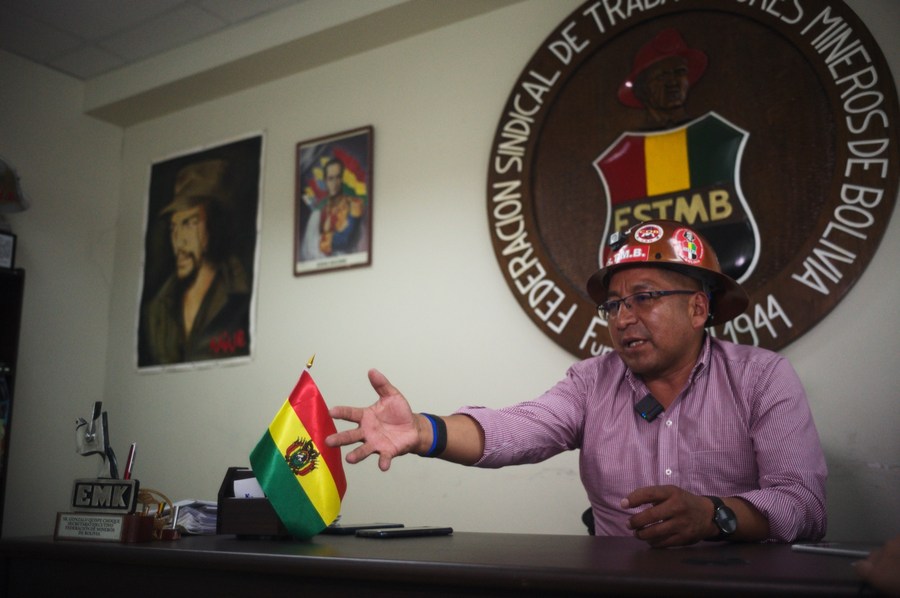 Imagen del secretario ejecutivo de la Federación Sindical de Trabajadores Mineros de Bolivia (FSTMB), Gonzalo Quispe Choque, en entrevista con Xinhua. (Xinhua)