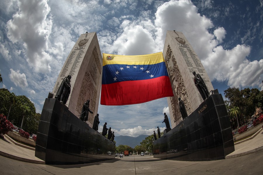 Imagen de archivo del izamiento de una bandera nacional venezolana en el Paseo de los Próceres, en la ciudad de Caracas, Venezuela. (Xinhua/Boris Vergara)