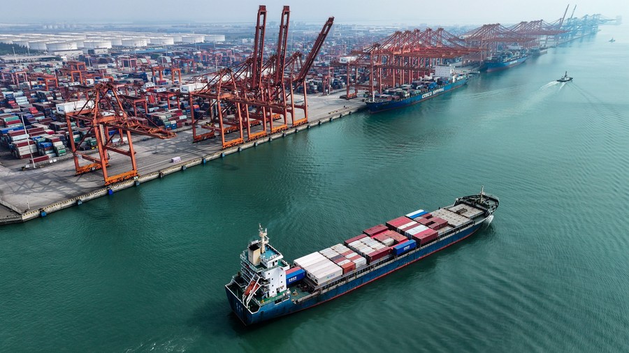 Vista aérea del 24 de noviembre de 2023 de un buque portacontenedores saliendo del puerto de Qinzhou, en la ciudad de Qinzhou, en la región autónoma de la etnia zhuang de Guangxi, en el sur de China. (Xinhua/Zhang Ailin)