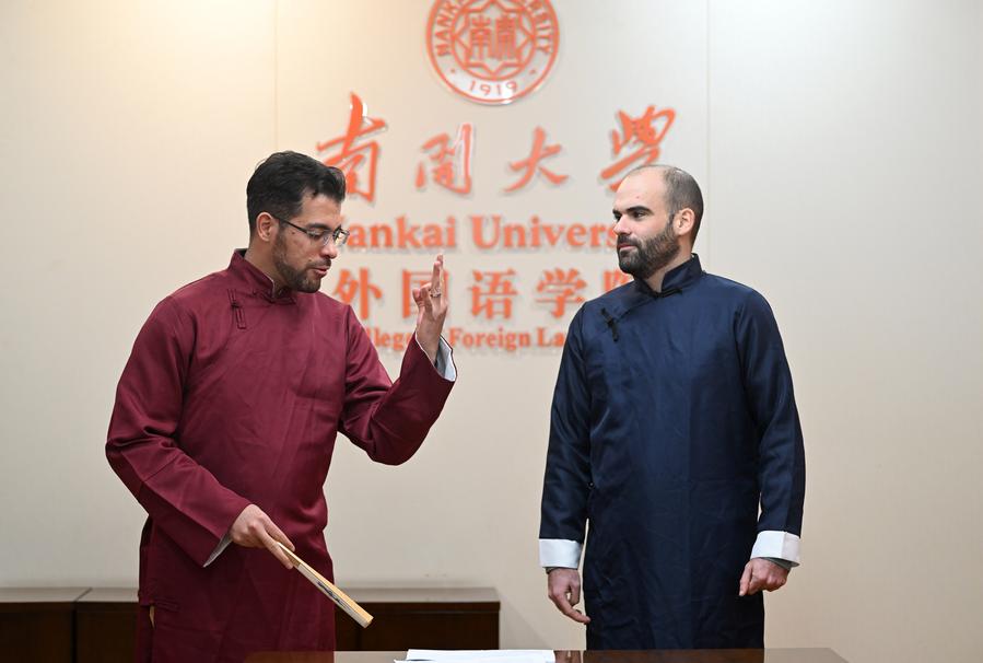 TIANJIN, 18 ene (Xinhua) -- Ataviados con changshan, un largo vestido tradicional chino, y sosteniendo abanicos plegables en la mano, dos extranjeros practicaban el diálogo cómico tradicional Xiangsheng en un aula de la Universidad de Nankai, en la municipalidad de Tianjin, en el norte de China. La audiencia escuchaba atentamente y por momentos estallaba en carcajadas.