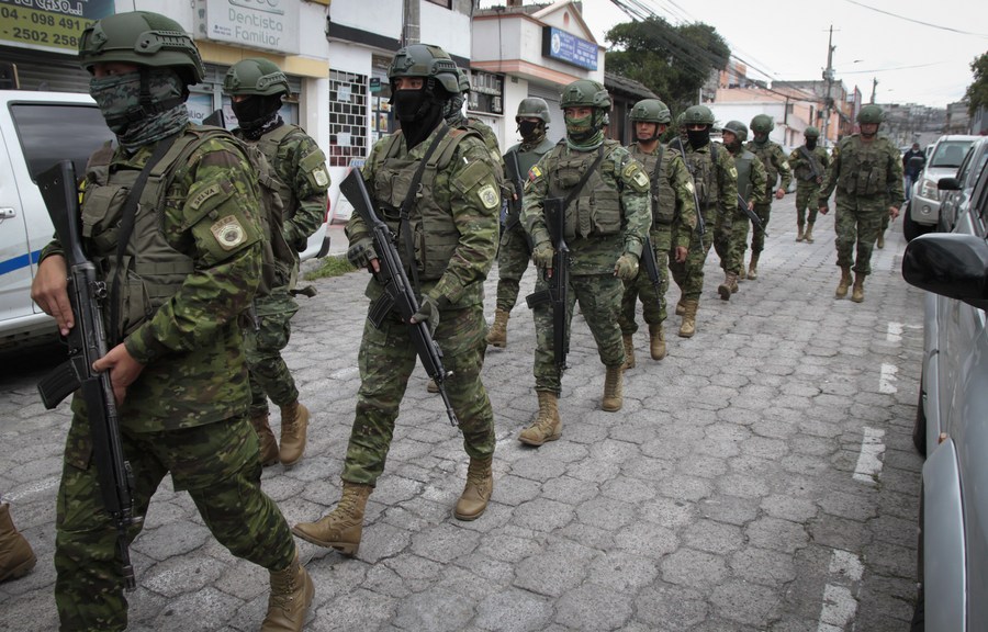 Militares llegan a vigilar un Centro de Rehabilitación Social, en Quito, capital de Ecuador, el 9 de enero de 2024. (Xinhua/Str)
