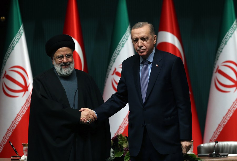 El presidente turco, Recep Tayyip Erdogan (d), estrecha la mano con el presidente iraní, Ebrahim Raisi en una conferencia de prensa conjunta, en Ankara, Turquía, el 24 de enero de 2024. (Xinhua/Mustafa Kaya)