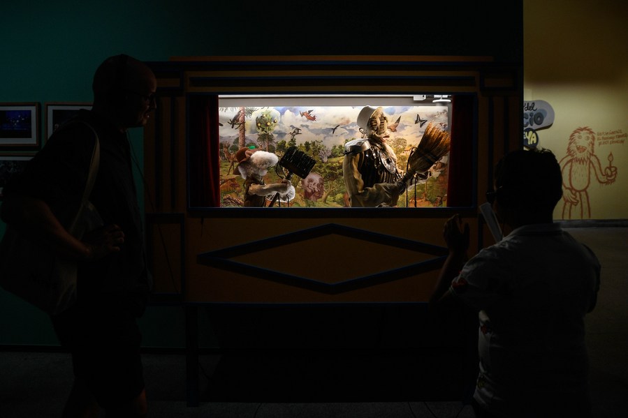 Personas visitan la exposición "Museo 31" de la serie de televisión infantil "31 Minutos" durante el Festival Internacional Teatro a Mil, en Santiago, capital de Chile. (Xinhua/Jorge Villegas)