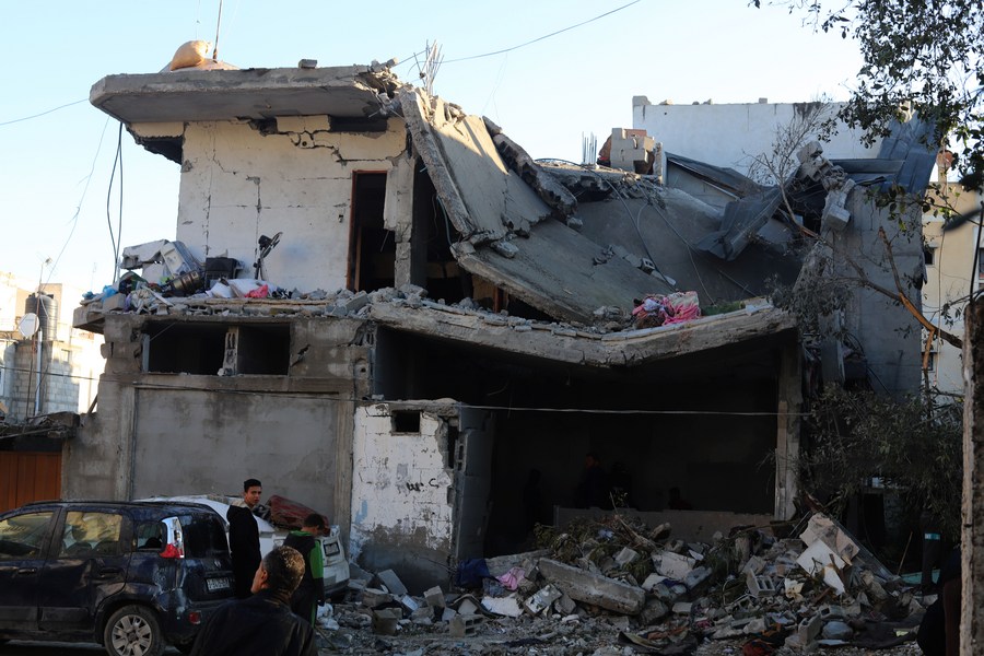 Palestinos inspeccionan los escombros de un edificio después de los ataques aéreos israelíes, en la ciudad de Rafah, en el sur de la Franja de Gaza, el 3 de febrero de 2024. (Xinhua/Khaled Omar)