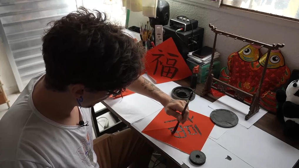 Este músico de 26 años, oriundo de la ciudad de Sao Paulo, la mayor urbe sudamericana, decidió decorar gran parte de su casa con farolillos y nudos chinos, y las puertas de su hogar con carteles rojos con el carácter chino Fu (suerte), en homenaje al Año Nuevo chino, o Fiesta de la Primavera.