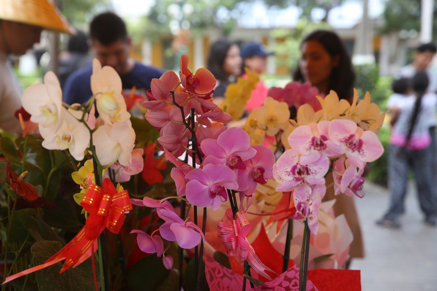 Personas visitan la feria de flores "En San Valentín, dilo con flores" llevada a cabo con motivo del Día de San Valentín en el Parque Municipal de Barranco, en el distrito Barranco, en Lima, Perú, el 13 de febrero de 2024. (Xinhua/Mariana Bazo)