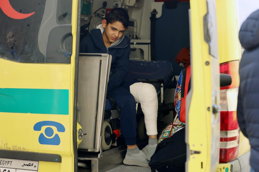 Imagen del 5 de febrero de 2024 de palestinos heridos visto en una ambulancia, en el lado egipcio del cruce fronterizo de Rafah. (Xinhua/Mohamed Ahmed)