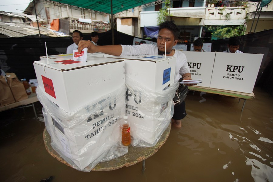 Personas votan en un centro electoral sumergido en agua de inundación, en Yakarta, Indonesia, el 14 de febrero de 2024. (Xinhua/Gemma Galgani)