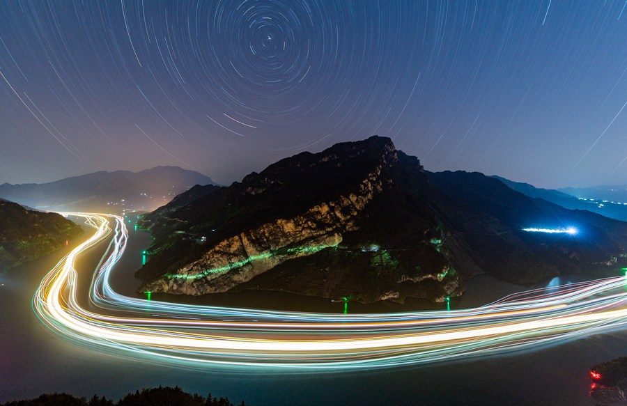 Imagen de exposición prolongada del 13 de noviembre de 2020 del paisaje nocturno de barcos navegando en una sección de la Garganta de Xiling a lo largo del río Yangtse, en el distrito de Zigui, provincia de Hubei, en el centro de China. (Xinhua/Zheng Jiayu)