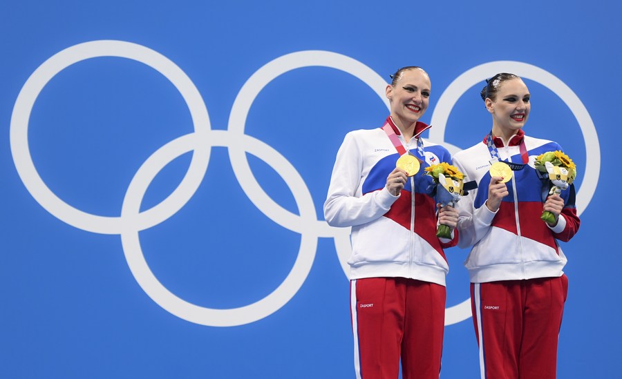 Svetlana Kolesnichenko, y Svetlana Romashina, del Comité Olímpico de Rusia, asisten a la ceremonia de premiación de la final de dúo rutina libre de la competición de natación artística, en los Juegos Olímpicos de Tokio 2020, en Tokio, Japón, el 4 de agosto de 2021. (Xinhua/Xia Yifang)