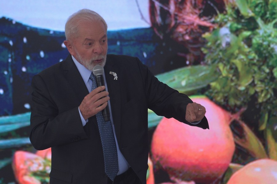 El presidente brasileño, Luiz Inácio Lula da Silva, habla durante la ceremonia de apertura de la primera reunión del Consejo Nacional de Seguridad Alimentaria y Nutricional en el Palacio de Planalto, en Brasilia, Brasil, el 5 de marzo de 2024. (Xinhua/Lucio Tavora)
