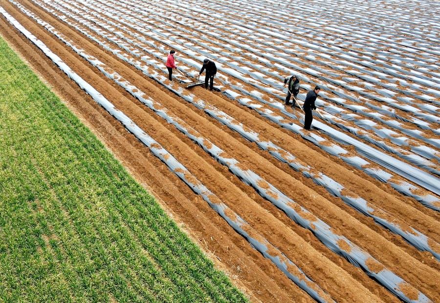 Vista aérea del 5 de marzo de 2024 de agricultores trabajando en el campo, en el municipio de Difang, en el distrito de Pingyi, en la provincia de Shandong, en el este de China. (Xinhua/Wu Jiquan)