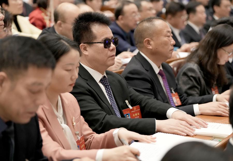 BEIJING, 12 mar (Xinhua) -- Sentado en el Gran Palacio del Pueblo en Beijing, el legislador nacional chino Wang Yongcheng pasó sus dedos por los puntos elevados del informe sobre la labor del Gobierno en braille mientras escuchaba el documento entregado por el primer ministro.