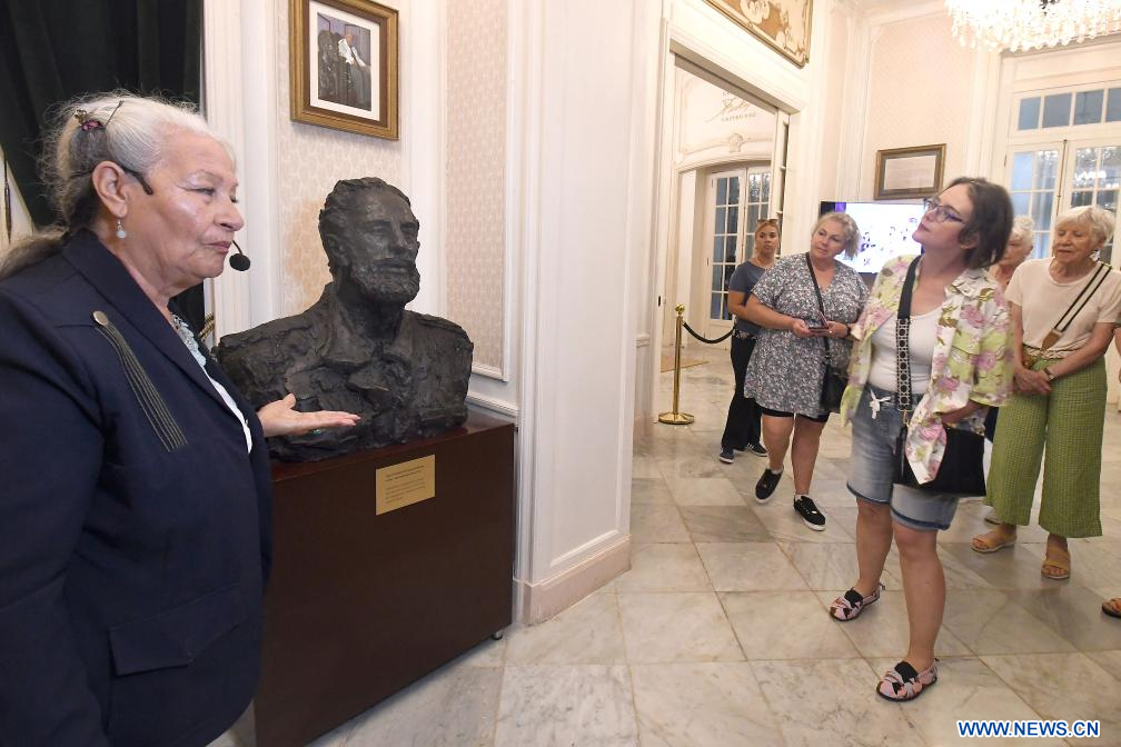 LA HABANA, 13 marzo, 2024 (Xinhua) -- Imagen del 13 de febrero de 2024 de una museóloga (i) dando información a un grupo de personas que visita el Centro Fidel Castro Ruz, en La Habana, capital de Cuba. El Centro Fidel Castro Ruz, ubicado en la barriada habanera del Vedado, atesora y exhibe un busto del líder histórico cubano Fidel Castro (1926-2016), considerado un símbolo de la amistad entre Cuba y China. (Xinhua/Joaquín Hernández)
