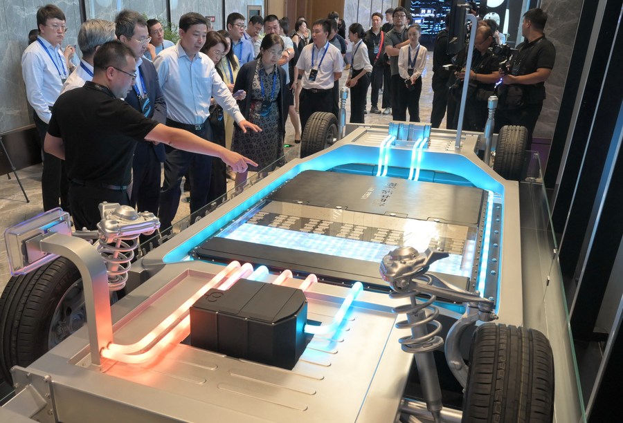 Visitantes observan la batería de carga superrápida Shenxing, en Ningde, provincia de Fujian, en el sureste de China, el 16 de agosto de 2023. (Xinhua/Lin Shanchuan)