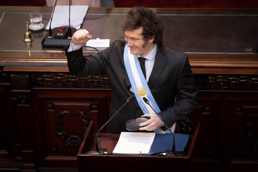 Imagen del 1 de marzo de 2024 del presidente argentino, Javier Milei, reaccionando durante la asamblea de apertura del 142 período de sesiones ordinarias del Congreso Nacional, en la ciudad de Buenos Aires, Argentina. (Xinhua/Martín Zabala)