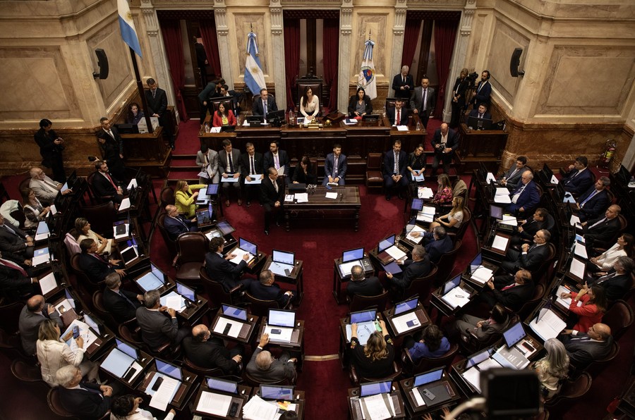 Imagen del 14 de marzo de 2024 del recinto de la Cámara de Senadores durante la sesión en la que se debatió la aprobación o rechazo de un decreto de necesidad y urgencia (DNU) del presidente argentino, Javier Milei, en el Congreso Nacional, en la ciudad de Buenos Aires, Argentina. (Xinhua/Martín Zabala)