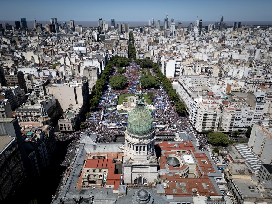 Vista aérea tomada con un dron el 24 de enero de 2024 de la Plaza de los Dos Congresos durante una manifestación en el marco del paro general de actividades dispuesto por sindicatos y organizaciones sociales, en la ciudad de Buenos Aires, Argentina. (Xinhua/Ezequiel Putruele)